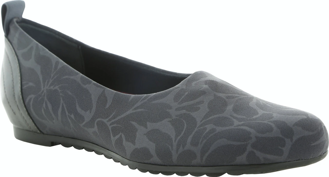 Englin’s Fine Footwear presents the women’s ‘Iriana’ from Munro. The Iriana is a simple slip-on style with a floral design on the fabric that is both attractive and charming. The pattern almost has a lustrous look for a great addition for your dress wardrobe. With a leather trim on the outside heel counter, you can pair this comfortable slip-on with your casual wardrobe, too.